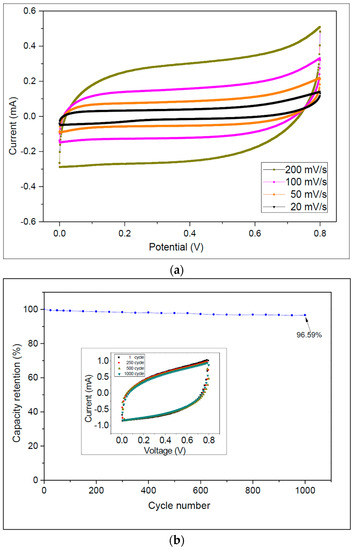 Obviously, at very low scan rates, the capacitance values are higher because the ions have sufficient time to penetrate and reside in all the available pores on electrodes, thereby forming electric double layers, which are essential to yield larger capacitance. Using Equation (1), a maximum specific capacitance of 107.27 mF/cm2 was obtained at a scan rate of 20 mV/s.