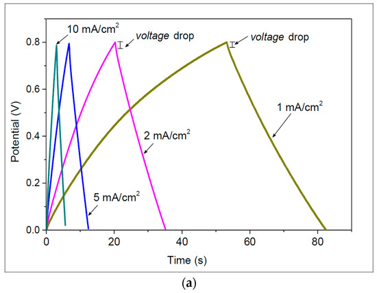 where i is the discharge current, ΔV is the potential drop during discharge, and A is the total active area of electrodes. The calculated maximum specific capacitance using Equation (2) was 76.5 mF/cm2 at a constant current of 1 mA/cm2. Table 4 shows the calculated specific capacitance for each current density.