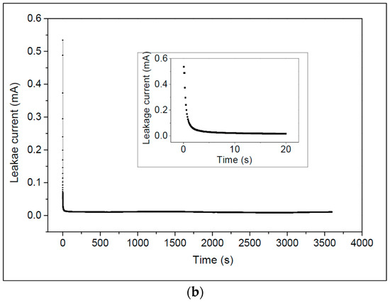 Figure 7b shows the leakage current curves of the device, which was charged at 2 mA from 0.0 to 0.8 V, and then maintained at 0.8 V for 3600 s. At the onset of the charging, the leakage current dropped significantly (from 0.534 mA to 19.8 µA after 10 s). The leakage current then decreased gradually and reached a steady value of approximately 9.95 µA after 3600 s.