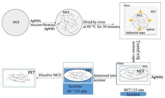 Silver nanowires with a mean diameter of about 120 nm and a length of 20–70 μm were synthesized by our reported polyol process []. 12.67 mg·mL−1 AgNWs suspensions were diluted down to 0.0022 mg·mL−1 with deionized water and sonicated for one minute. AgNWs diluent dispersions were dispersed into 500 mL deionized water and deposited on porous MCE membrane to form AgNWs networks with different densities by vacuum filtration. The AgNWs-MCE film was placed on a hard plastic plate with binder clips and dried by oven at 80 °C for 30 min. Further, the AgNWs-MCE film was fixed with four pins located in the middle of each boundary on a PET by adhesive tapes to ensure the MCE entirely was completely in contact with the PET. The AgNWs-PET-MCE film was treated with acetone vapor at 80 °C for 15 min. Then, the sample was immersed into acetone at 60 °C for 10 min to completely dissolve the MCE. Figure 1 shows the schematic illustration of the preparing AgNWs film process.