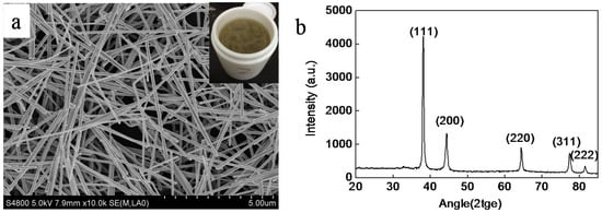 (a) SEM image and (b) XRD of the silver nanowires. The photo of silver nanowires synthesized by a solvothermal process is inserted in Figure 2a.