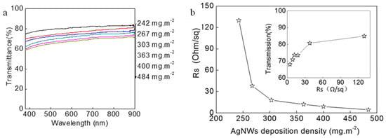 The optical transmittance spectra (Figure 3a) and the sheet resistance (Rs) of AgNWs films with different deposition densities (in grams deposited per square meter) of AgNWs are shown in Figure 3. The relationship of the Rs and the transmittance at 550 nm of AgNWs film is inserted in Figure 3b. The transmittance was measured with a transparent PET film as the reference. Both of the transmittance and the Rs of the AgNWs films decrease with the increase of deposition density of AgNWs. When the deposition density of AgNWs is 242 mg·m−2, the transmittance of AgNWs film at 550 nm is over 84%, and the Rs is above 130 Ω·sq−1. Increasing the deposition density of AgNWs to 267 mg·m−2, a dramatic decrease in the Rs (38 Ω·sq−1) was observed in Figure 3b, and the transmittance of AgNWs film at 550 nm is 81% (Figure 3a), which is better applied to the transparent conductive film. The Rs and the transmittance of AgNWs film with 400 mg·m−2 deposition density decreases to 9 Ω·sq−1 and 71%, respectively. It is clear that the conductive networks of AgNWs gradually increase with the increase of the deposition density of AgNWs. Under the condition of the low deposition density of AgNWs, the increase of a small amount of AgNWs can improve the conductivity significantly. However, when the deposition density of AgNWs reaches a certain value, effective conductive networks form, which has a small effect on the deposition density of AgNWs with regard to conductivity. The dense conductive networks lead to a decrease in transmittance of film.