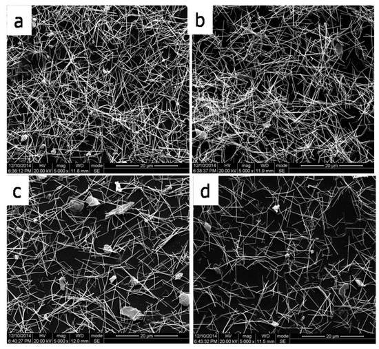SEM images of AgNWs-PET films with different deposition densities of AgNWs, (a) 363, (b) 303, (c) 267, and (d) 242 mg·m−2.