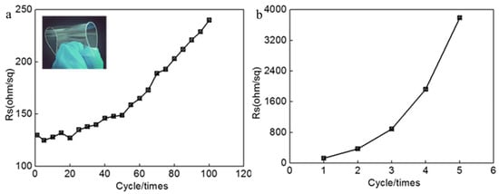 Rs of AgNWs films versus cycle time of folding up (a) and tape test (b).