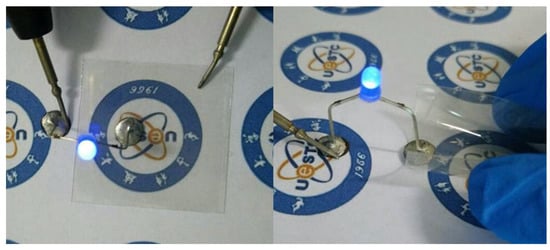 One 0.06 W LED lamp with series fixed on the surface of AgNWs-PET electrode with conductive adhesive were luminous, and they were still luminous after bent (Figure 8).