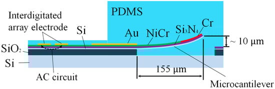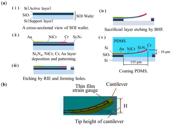 Figure 4a shows a cross-sectional view of fabrication process of the sensor, and Figure 4b shows a schematic illustration of cantilever. Si3N4 thin film was deposited as an insulating layer on a Si-on-insulator (SOI) wafer, then NiCr as thin film strain gauge layer, Au as a surface electrode and wiring layer, and Cr as a stress layer were deposited and patterned, respectively. Where, Si3N4, NiCr, and Au were deposited by sputtering method, and Cr was deposited by electron beam evaporation method. Thereafter, the Si active layer was anisotropically removed by reactive ion etching (RIE) and a pattern was formed for sacrificial layer etching. SiO2 layer was etched in buffered hydrofluoric acid (BHF, 20%, 30 °C) for 150 min to release the upper structure as a cantilever. The released cantilever was warped by residual stress due to the difference in coefficient of thermal expansion between the Cr layer and the Si layer [19]. Although poly Si can be used as the layer for the cantilever structure, in this work, we employed single-crystal Si because of its uniformity of mechanical and optical characteristics. Furthermore, poly-dimethyl-siloxane (PDMS) elastomeric layer was coated on the chip in order to protect the chip surface, and a PDMS bump (1.6 mm diameter, 2 mm height) as a contact part was attached to center of the chip.
