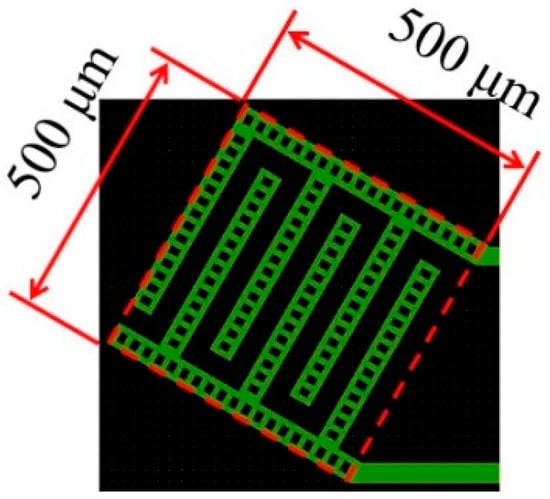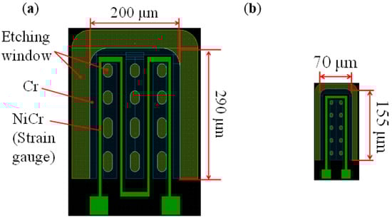 Figure 1 shows a schematic diagram of cross-sectional view of the sensor. In our tactile sensor, a strain gauge is formed on the microcantilever embedded in PDMS as tactile detection part (right part of Figure 1). In previous works, the size of one cantilever is comparatively large as 290 × 200 μm, and it was difficult to locate the cantilevers with high density similar to tactile receptors of human. Therefore, in this work, we aim to (1) reduce the size of the cantilever; and (2) place the cantilevers more densely. Furthermore; (3) an interdigitated array electrode (left part of Figure 1) is newly designed to improve the sensitivity as proximity sensor [18]. The pattern of the new sensor was designed using IC layout CAD (LayoutEditor, juspertor GmbH, Unterhaching, Germany). Figure 2a,b shows design drawings of a conventional cantilever and a newly fabricated cantilever, respectively. Cr pattern and NiCr meander wiring are formed on the cantilever. Etching windows for sacrificial etching of SiO2 under the cantilever are also formed around and in the pattern of the cantilever. The cantilever will be warped upward by residual stress in a Cr layer after sacrificial etching, as shown in Figure 1. Comparing Figure 2a,b, the area of the cantilever part is reduced to one-fifth from the conventional one, and it is possible to locate more densely. Figure 3 shows the interdigitated array electrode for light detection. When the sensor surface is irradiated with light, resistance, and depletion layer capacitance in the Si layer decrease because of generation of electron–hole pairs (photocarriers). Because the interdigitated array electrode is electrically connected to the Si layer via capacitance of Si3N4 insulation layer as AC circuit shown in Figure 1, the impedance of the electrode decreases with increase of the light intensity. Thus, the light intensity can be detected as decrease of the impedance of the electrode [16]. In previous works, the light is detected as impedance between wiring electrodes [16,17]. It is found that contribution of depletion layer capacitance to light sensitivity is larger than that of resistance in the Si layer [18], however, effect of resistance in the Si layer is comparably large because of gap between wiring electrodes (>100 μm). Therefore, to decrease the gaps between electrodes and effect of resistance, we employ interdigitated array electrodes with narrow gaps in this work. The size of the interdigitated electrode array is 500 × 500 μm, and it is located so as not to interfere with the cantilevers and wire. In addition, the interdigitated electrode array has mesh holes to increase the amount of incident light on Si. This is because it has been demonstrated that light sensitivity can be enhanced by forming a lot of mesh holes [18].