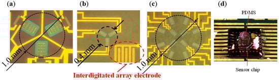 Optical microscopic images of (a) conventional sensor, (b) newly fabricated sensor of Type A, and (c) newly fabricated sensor of Type B, and (d) the sensor chip with PDMS.