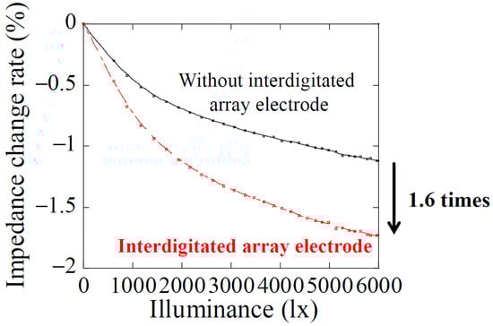 The tactile sensor fabricated in this work is employed single crystal silicon which is a typical semiconductor material as the main substrate material. Hence, when the sensor is irradiated with light, electron–hole pairs as photocarriers are generated by excitation of valence electrons due to the photoconductive effect, and electric resistivity and depletion layer capacitance in Si layer are modulated. By detecting these changes as an impedance change in the Si layer by reflected light from the object, proximity distance can be measured. To confirm the optical responsivity, the dependence of impedance change of the interdigitated array electrode on light illuminance was measured, as shown in Figure 6. This measurement was performed in a darkroom, and the impedance was measured using an LCR meter (Hioki 3532-50, Hioki E.E. Corporation, Nagano, Japan) at the measuring frequency of 5 MHz. The impedance decreases with increasing light illuminance in both cases of the sensor with and without interdigitated array electrode. It is found that the optical responsivity of the sensor with interdigitated array electrode is 1.6 times higher than that without interdigitated array electrode. This is because the change of depletion layer capacity when light is irradiated is increased by electrode of mesh structure. Therefore, proximity detection with higher sensitivity than previous works is expected using the sensor designed in this work.