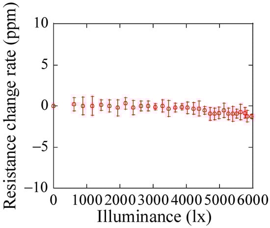 In order to detect the force and proximity separately, it is required that the strain gauge resistance on the cantilever is sensitive only to strain and has no sensitivity to light. Therefore, the illuminance dependency of the strain gauge resistance of the newly manufactured cantilever was measured. This measurement was performed in a darkroom, and the strain gauge resistance was measured by a digital multimeter (Advantest R6581, Advantest Corporation, Tokyo, Japan). Figure 7 shows resistance of the strain gauge as a function of light illuminance. It is found that the resistance is nearly independent of light illuminance. Thus, it is possible that the sensor can detect separately force and proximity.