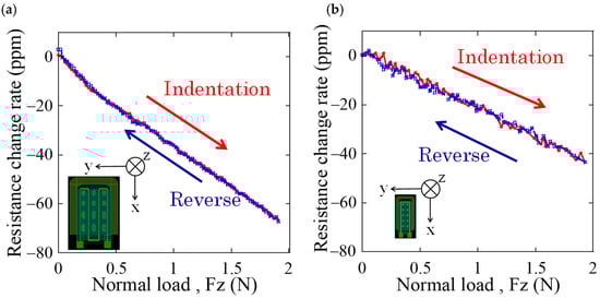 Next, in order to measure the load response characteristics of the newly fabricated cantilever, resistance change of the strain gauge was measured when normal and shear loads were applied to the sensor. Figure 8 and Figure 9 show the comparison of resistance changes for normal and shear loads between the sensors fabricated in previous and this works, respectively. From Figure 8, the newly fabricated cantilever has sensitivity to normal load, however, it is two-thirds lower than that of previous one. On the other hand, from Figure 9, it is found that sensitivity to shear load of the newly fabricated cantilever is approximately 2.1 times higher than that of the previous one. It is considered that this sensitivity difference is due to the size and tip height of the cantilever. The cantilever in previous cantilever has tip height of 30 μm and length of 290 μm, hence, its angle is approximately calculated as 5.9° using arc tangent. On the other hand, that of the new cantilever with tip height of 9.6 μm and length of 155 μm is calculated as 3.5°, which is smaller than previous one. Conversely, it is suggested that we can calibrate the sensitivities to normal and shear loads by controlling the tip height of the cantilever. In addition, it has been confirmed that the warp of the newly fabricated cantilever is not uniform and only its tip is locally lifted up. As a result, it is considered that the sensitivity is enhanced by the large deformation of the cantilever when applied shear load. From the above results, it is demonstrated that the sensor with miniaturized cantilever in this work has sensitivities to both normal and shear loads similar to that in previous works.