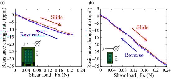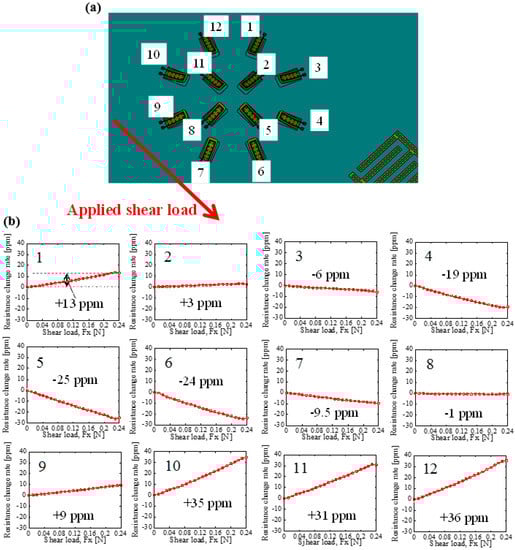 To demonstrate tactile sensing with cantilevers located at higher density, responses from 12 cantilevers (Type B shown in Figure 5c) to an applied shear load have been characterized. Shear load was applied uniformly on the sensor surface to direction shown in Figure 10a. Figure 10b shows responses of 12 cantilevers in the sensor Type B. The value in ppm shows resistance change rate when applied shear load is 0.24 N. Cantilevers numbered 10, 11, and 12 as shown in Figure 10a show similar response (positive resistance change) to shear load because their direction is similar to the direction of shear load. On the other hand, cantilevers 4, 5, and 6—which are located at the opposite side—show negative resistance change because their direction is opposite to the direction of shear load. Furthermore, the other cantilevers located at orthogonal direction to shear load has less response. From these results, it is found that response of the cantilever depends on relationship between directions of it and shear load. Therefore, it is demonstrated that condition of contact load distribution during gripping control can be detected using the sensor with high density cantilever array fabricated in this work.