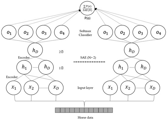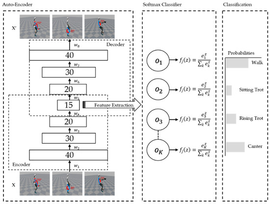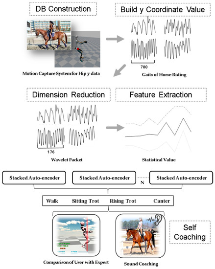 In the sports coaching field, Saponara [24] presented a wearable biometric performance measurement system for combat sports, Dhruv [25] researched new integrated technologies that allow coaches, physicians, and trainers to better understand the physical demands of athletes in real time. Extant studies [26] can be a weakness in terms of reliability because of insufficient data. In this study, we constructed a big database, and it is possible to extract a reasonable performance. As data increased, adaptive neuro-fuzzy inference system (ANFIS) [26] faced limitations in performance and time. Therefore, we could solve problems by applying deep learning. Additionally, the ESAE is used for classifying horse gaits. AE can be converted into an ensemble form, which can have a synergistic effect on performance enhancement. In this paper, we propose an ESAE based on motion data of the horse rider. The reason for the classification of horse gaits is that the posture changes according to the horse gaits. The results showed that the angle of each joint was different about gaits of the horse. So, the standard of coaching can be different for each gait. In this paper, the goal is to construct the motion and position database (DB) of the expert rider and compare with the amateur to detect false motion for each horse gaits. This paper also aims to provide real-time horse-riding coaching by providing feedback to the user about posture. The rider’s posture is different for each of the four types of horse gaits. For this reason, the motion of an expert can serve as an example for a beginner. This paper is organized as follows. In Section 2, we describe related research on AEs and SAEs. Algorithms are described in terms of mathematical theorems and concepts. Section 3 describes the proposed method. We describe a feature extraction method using a wavelet packet, and the methods applying five statistical values (maximum value, minimum value, average, variance, and standard deviation) are described. Section 4 describes the DB construction method and the outline of the experiment. In addition, it describes how to build a horse-riding DB. Experiments using the proposed method and comparison algorithm are shown. Section 5 summarizes the conclusions and future challenges.