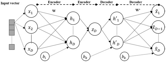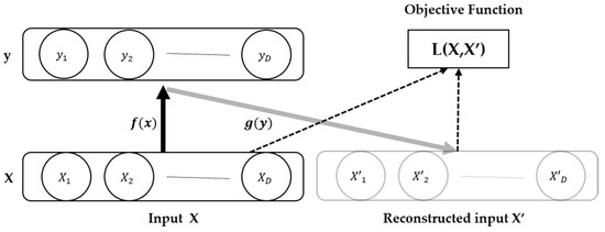 is an active function, mainly a sigmoid function and ReLu function. Next, the auto-encoder decoding step is a result of projecting the new weight value and summing the bias values with z obtained in Equation (1). X’ is defined as Equation (2).