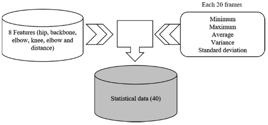 In the previous study [26], we experimented with the elbow angle and the y-axis coordinate data of the hip, whereas in this study, we experimented with forty additional features. Feature values are extracted from 12,000 frames. The feature extraction method gradually extracts five feature values (average, maximum, minimum, variance, and standard deviation) from 1 to 20 frames like mask filter. The data are characterized by eight feature values: y-axis coordinates of the hip, backbone angle, right elbow angle, left elbow angle, right knee angle, left knee angle, elbow distance, and knee distance. We experimented sequentially with 10–100 frames; however, the best performance was achieved at 20 frames, and many features were obtained by taking advantage of the big data feature of AEs. Statistical values are a powerful tool for analyzing time series data. Eight features are generated from the sensor data, and five features are extracted for every frame based on eight features. Finally, 40 features are built. As a result, it is better to apply five feature values than to use a single minimum, a maximum, and an average value. Figure 6 shows a method of constructing statistical data.