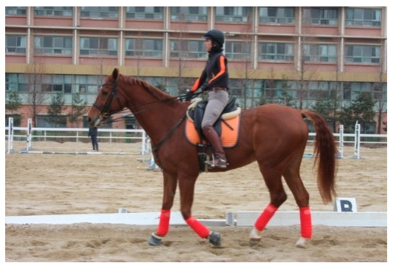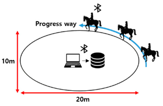 Motion data is acquired from an expert of horse riding who made one or two revolutions per gaits (walk, sitting, trot, rising trot, and canter) of an oval horse-riding course 20 m in length and 10 m in breadth while wearing a motion capture suit. Using the 3D motion capture suit based on Xsens inertial sensors, data were extracted in the order of Jeju (137 cm or less), Thoroughbred (160 cm), and Warm Blood (150–173 cm). It took 1 to 2 min to measure a file. Figure 11 shows the environment for data acquisition.