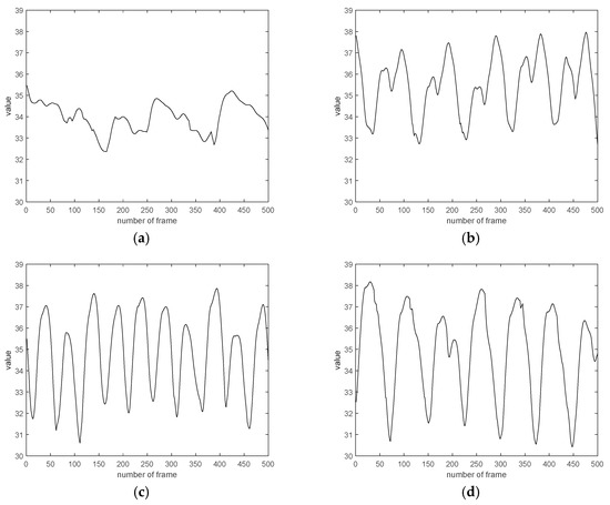 Hip y data with four kind of horse gaits. (a) Hip y data for walk, (b) hip y data for rising trot, (c) hip y data for sitting trot, and (d) hip y data for canter.
