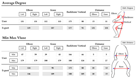 There are various approaches to coaching horse riding, such as muscle utilization, posture, and tacit understanding with a horse. We develop a system that allows users to visualize their data and compare professional posture with amateur posture. Numerically, a range of the maximum value and the minimum value is visually expressed from each feature value. Self-coaching can be achieved by comparing feature values for each frame with an expert. Figure 12 shows a coaching system for horse riding, and Table 2 shows a numerical comparison of walk and canter.