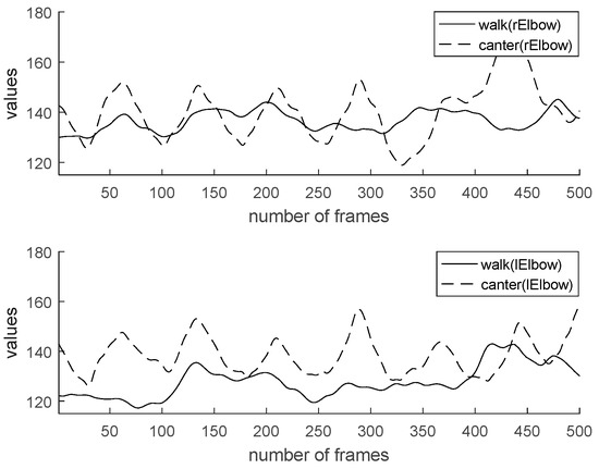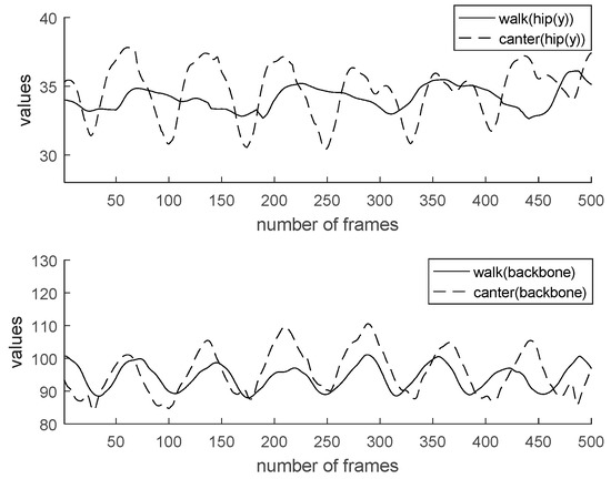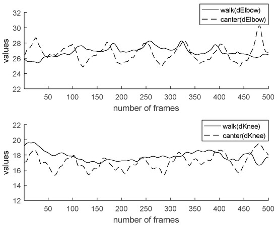 Characteristics of walk and canter are analyzed for the sake of coaching. Generally, the data value of horse riding has a cycle. By checking the frame-by-frame period, the user’s motion can be recognized. Figure 13 shows a comparison of two feature values (hip y, an angle of backbone) by gaits. In the case of Figure 13, the change in the value controls the rider’s hip height range. We can see it move more significantly in the canter than in the walk. The canter represents greater movement than the walk regarding elbow angle, knee angle, and backbone angle. Also, the cycle of canter is shorter than walk. Figure 14 shows a comparison of two feature values (an angle of right elbow, an angle of left elbow) by gaits. Figure 15 shows comparison of two feature values (an angle of right knee, an angle of left knee) by gaits. Figure 16 shows a comparison of two feature values (a distance of elbow, a distance of knee) by gaits.