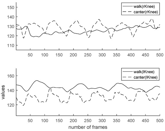 Comparison of two feature values (angle of right knee, angle of left knee) by gaits.