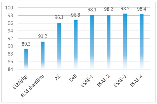 This study focused on employing an ESAE to classify horse riding gaits to facilitate real-time coaching. To classify the actual horse-riding gaits, an ESAE with a higher classification rate and real-time posture coaching should be used. In summary, the ESAE exhibited the best performance for classification. According to classification results and the motion information such as the hip value, which is the main parameter for motion analysis and coaching, we can apply the proposed method to the coaching system, for each horse gaits, and for a rider under real or simulated environments. When three SAEs were used, the hidden size of ESAE was set to 30, 20, and 10, respectively, and when two SAEs were used, they were set to 46 and 15, respectively. When a single AE was applied, the average performance was 96.1%, and when a single SAE was applied, the performance was 96.8%. Two kinds of data were used: the hip value and eight characteristic values. The statistical data exhibited good performance in all algorithms, because it could separate all data characteristics well. Among them, the ESAE showed the best performance. Table 3 indicates a comparison of performance using hip y data with wavelet packet. Figure 17 shows the performance of ESAE for 40 feature data with wavelet packet. Figure 18 shows a comparison of performance using 40 feature data with wavelet packet.