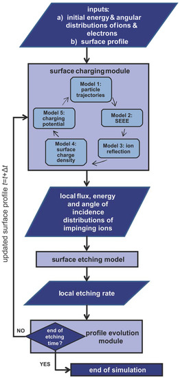 The modeling framework is made up of (a) the surface charging module [25], (b) the surface etching model [26], and (c) the profile evolution module [27]. The coupling among modules of the framework is portrayed in the schematic diagram of Figure 1. The inputs are the energy and angular distributions of ions and electrons together with the initial surface profile.