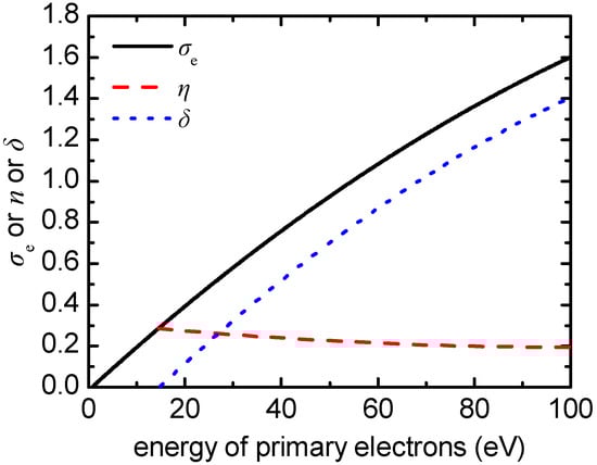 η from Equation (1) increases rapidly as the energy of the primary electron goes to zero and, strictly speaking, Equation (1) results in η > σe for 0 to 16 eV, something that is not realistic. A compromise is to consider that n below 16 eV is equal to σe. Thus, δ, i.e., σe − η, is considered equal to zero for energy lower than 16 eV (Figure 2). It should be noted that the value of 16 eV is not far from the value of 12.6 eV, i.e., the average energy required to produce one secondary electron for PMMA [36]. It is also not far from the value of 10 eV, the general threshold for the secondary electron emission process [43]. For energy greater than 16 eV, δ is calculated as the difference of σe and η (Figure 2).