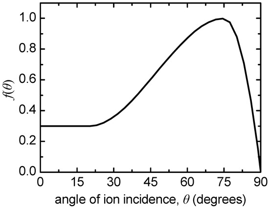 where E+ is the ion energy and Eth is the threshold ion energy for PMMA sputtering. Eth is regarded equal to 4 eV and A equal to 0.1 monomers/(ion·eV0.5) [26]. θ in Equation (4) is the angle of incident ions. The angle dependence being manifested by f(θ) is depicted in Figure 3. It is typical for cases of physical sputtering [55,56] and is approximated by a simple polynomial function, the form of which can be found in [26].