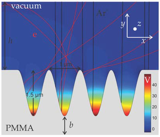 The initial sinusoidal profile of the PMMA surface. The steady state potential, as well as some of the ion (in black) and electron (in red) trajectories, are also depicted. h is the height of the vacuum space, and b is the thickness of the PMMA layer. h is 2.2 μm, and b >> h.