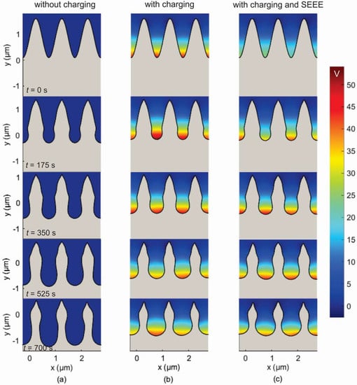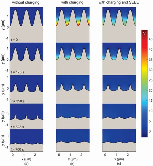 In Figure 6 the same results as in Figure 5 are shown, including the ion reflection mechanism. Charging is omitted in Figure 6a, while it is considered in Figure 6b and, ultimately, in Figure 6c, besides charging, SEEE is also taken into account. First, by comparing Figure 5 and Figure 6, it is shown that when the ion reflection is taken into account, the profile features are sustained until the end of the etching time, i.e., roughness is not eliminated. Second, when charging is taken into account, the peaks of the profile are shorter and thinner (cf. Figure 6a,b). Third, as in the case without ion reflection, although SEEE initially (t < 175 s) induces a decrease of the charging potential, there are no apparent differences in the profiles with and without SEEE (cf. Figure 6b,c). This is because the available surface for electron reflection or emission towards the valleys is reduced. The SEEE mechanism just redistributes the incident electrons locally in the profile valleys and this local redistribution does not significantly affect the electron flux (and, hence, the electric potential).