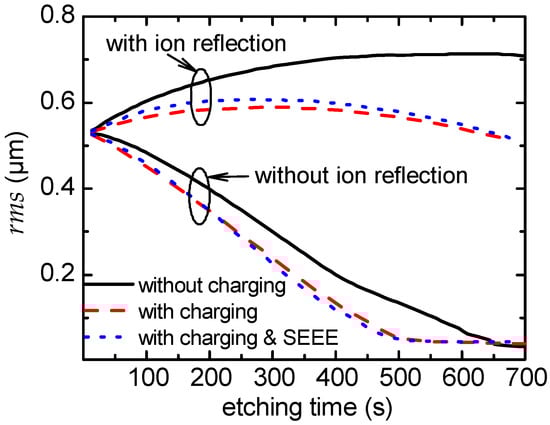 Starting from an initial surface profile with microscale roughness, the calculations showed that the surface charging contributed to a faster roughness elimination compared to the case without charging. For the cases studied, the effect of SEEE on the evolution of rms roughness was marginal. When the ion reflection was considered, the profile features were preserved until the end of the etching time, i.e., roughness was not eliminated. In that case, charging not only constrained the rms roughness at the initial stages of etching but, afterwards, it led to a decrease of the rms roughness.