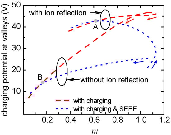 Figure 8 includes the charging potential at the bottom of the valleys (average value at the four valleys) versus m for the evolving profiles shown in Figure 5 and Figure 6. The arrows on the curves denote the time path during etching. Without ion reflection, the charging potential decreases with the decrease of m, either SEEE is taken into account or not. With ion reflection and without SEEE, there is an almost linear correlation between the potential and m. This linear correlation is disturbed when SEEE is taken into account and is restored when the SEEE effect fades away: the two curves after point A almost coincide. This coincidence is also true for the curves without ion reflection after point B. Figure 8 demonstrates that, besides the different mechanisms and phenomena taken into account (with or without SEEE, with or without ion reflection), the mutual interaction between surface charging and profile roughness is present in all cases examined.