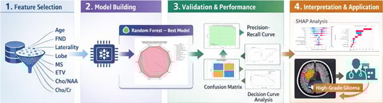 Background: Gliomas are the most common primary malignant tumors of the central nervous system. Accurate preoperative grading is essential for individualized surgical planning and treatment selection; however, reliable non-invasive prediction tools integrating multimodal preoperative data remain limited. This study aimed to develop and internally validate an interpretable machine-learning model for non-invasive glioma grading. Methods: Clinical and imaging data from 400 patients with pathologically confirmed gliomas were retrospectively collected. Twenty-four preoperative variables were analyzed. The dataset was randomly divided into training and validation cohorts (7:3). Feature selection was performed using a combination of the Boruta algorithm and logistic regression analyses, followed by correlation filtering. Seventeen machine-learning algorithms were benchmarked using five-fold cross-validation, and the optimal model was evaluated in the independent validation cohort using ROC analysis, calibration assessment, precision–recall curves, and decision curve analysis. Model interpretability was examined using SHAP. Results: Eight key predictors were identified, including age, focal neurological deficits, midline shift, tumor laterality, tumor lobar location, enhancing tumor volume, and MRS-derived Cho/NAA and Cho/Cr ratios. The Random Forest model achieved an area under the ROC curve of 0.946 (95% CI: 0.902–0.989) in the validation cohort. Calibration analysis demonstrated reasonable agreement between predicted and observed outcomes, and the precision–recall curve yielded an average precision of 0.98. Decision curve analysis indicated net clinical benefit across relevant probability thresholds. Conclusions: A multimodal machine-learning model integrating clinical, structural imaging, and MRS-derived metabolic features was developed and internally validated for non-invasive preoperative glioma grading. The model showed good discrimination and calibration and provided individualized probability estimates, suggesting potential value for preoperative risk stratification. However, clinical deployment remains premature, and further external validation is required.