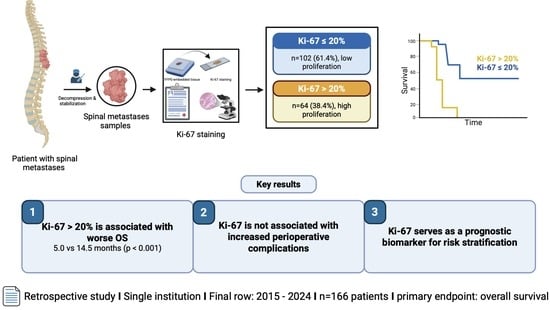 Background: The prognostic assessment of patients with spinal metastases is primarily based on clinical and radiological parameters. Biological tumor characteristics such as the proliferation marker Ki-67 have prognostic relevance in various metastatic settings. This study aimed to evaluate the prognostic impact of the