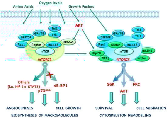 mammalian Target of Rapamycin (mTOR) complexes. mTOR protein forms two unique complexes, called mTOR complex (mTORC)1 and mTORC2. mTORC1 is activated by growth factors, amino acids, and energy levels, whereas mTORC2 is primarily responsive to growth factors. mTORC1 is comprised of the core proteins mTOR, Regulatory-associated protein of mTOR (Raptor), and mLST8; mTORC1 also binds other proteins in a species- and condition-specific manner: Proline-Rich AKT Substrate 40 (PRAS40), DEP domain-containing mTOR interacting protein (DEPTOR), GRp58, Tel2-interacting protein 1 (Tti1)- Telomere maintenance 2 (Tel2) and Rac1. mTORC2 includes the core proteins mTOR, Rapamycin insensitive companion of mTOR (Rictor), and mammalian Lethal with Sec13 protein 8 (mLST8), as well as various associated proteins, Proline-Rich Protein (PRR)5, Heat shock protein (Hsp) 70, DEPTOR, GRp58, Tti1-Tel2, Rac1, mammalian Stress-activated protein kinase Interacting protein (mSIN) 1 and Protein observed with RICTOR (Protor). mTORC1 regulates numerous processes including cell growth and proliferation, biosynthesis of macromolecules (proteins, DNA, and lipid synthesis), and angiogenesis, by regulating p70 ribosomal protein S6 Kinase 1 (p70S6K1) and Elongation Initiation Factor (EIF)-4E Binding Protein 1 (4E-BP1). mTORC2 controls cell structure, cytoskeletal reorganization, and survival by activating Serum and Glucocorticoid Kinase (SGK), Protein kinase B (AKT), and Protein-Kinase C (PKC).