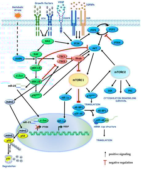 Deregulation of the mTOR pathway is associated with several metabolic and degenerative human diseases, including cancer; moreover, recent evidence shows that both high (i.e., cancer and neurological diseases) and low (i.e., atrophy of the muscle in certain situations and aging) levels of mTOR activity are implicated in different physiological and pathological processes. However, how these changes in mTOR activity are involved in the pathogenic mechanisms of these diseases is less clear: presumably, the different effects of mTOR activity are correlated with processes downstream of mTOR which are likely interconnected to all these diseases [].