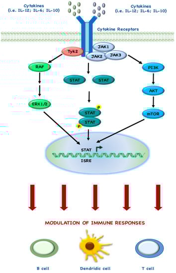 Several studies also describe the mechanisms behind the tight connection between mTOR and immune regulatory targets, as demonstrated by the Food and Drug Administration (FDA) approval of rapamycin as an immunosuppressive drug, due its ability to block T cell activation []. Indeed, during the past few years, many groups have demonstrated how mTOR regulates immune cell homeostasis, both in adaptive and innate immune cells and in recent years there has been accumulating evidence that STAT pathways also play a central role in immune responses, by interacting with the elements of mTOR pathway (Figure 3) [].