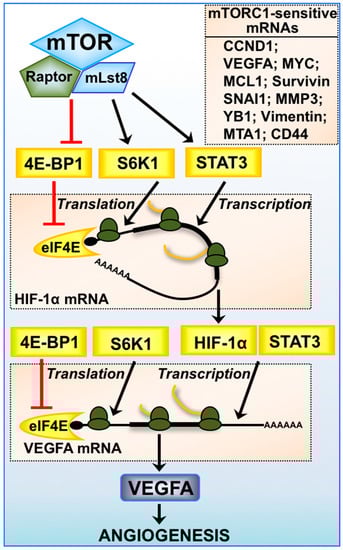Expression of mTORC1-sensitive mRNAs. mTORC1-mediated regulation of angiogenesis via HIF-1α and vascular endothelial growth factor A (VEGFA) is multifaceted, where transcription of HIF-1α mRNA is driven by STAT3 and VEGFA mRNA by both HIF-1α and STAT3. Protein translation of HIF-1α and VEGFA mRNA is highly dependent on the availability of eIF4E and the activity of S6K1. The 5′-untranslated region (UTR) of VEGFA mRNA is highly structured and is considered to be a 5′-TOP mRNA. Other mTORC1-sensitive mRNAs involved in cancer progression are listed: cyclin D1 (CCND1), myelocytomatosis (MYC), myeloid cell leukemia sequence 1 (MCL1), Survivin, snail family zinc finger 1 (SNAI1), matrix metalloproteinase-3 (MMP3), Y-box binding protein 1 (YB1), Vimentin, metastasis associated 1 (MTA1), and clusters of differentiation 44 (CD44).