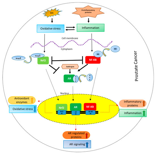Crosstalk between Nrf-2, NF-κB and AR in PCa: Oxidative stress leads to inflammation and vice versa. Oxidative stress results in the activation and nuclear localization of Nrf-2 after its dissociation from Keap1. Nrf-2 after localizing to the nucleus binds to the antioxidant response elements leading to the transcription and translation of antioxidant proteins. Inflammation, on the other hand, leads to the activation and nuclear localization of NF-κB after its dissociation from IκB, where it binds to NF-κB response elements leading to the transcription and translation of inflammatory proteins. Nrf2 signaling inhibits NF-κB signaling and vice versa. On the other hand, Nrf-2 inhibits AR whereas NF-κB activates AR signaling. AR after binding to androgens dissociates from HSPs (heat shock proteins), translocates to the nucleus leading to the transcription and translation of AR regulated proteins like prostate specific antigen (PSA).