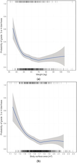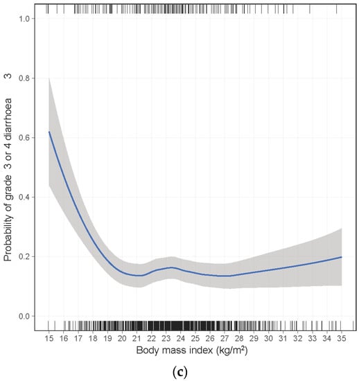 Loess locally weighted smoothed relationship between risk of grade ≥3 diarrhea and (a) body weight, (b) body surface area, and (c) body mass index.