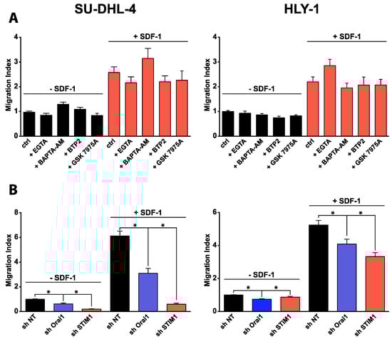 Orai1 and STIM1 regulate basal and SDF-1-induced DLBCL cell migration in a Ca2+ independent manner in vitro. Cell migration was assessed in 96-transwell chemotaxis chambers assay. Histograms represent mean ± SEM from at least 3 independent experiments, * p < 0.05. (A) Ca2+ is not necessary for DLBCL cell migration. To test the effect of the pharmacological agents on chemotaxis induced by SDF-1 (100 ng/mL), cells were pre-treated during 20 min in the presence or not of the agents before to be loaded to upper transwell chambers and pharmacological agents were maintained in medium during the experiment. BAPTA-AM, intracellular Ca2+ chelator, 5 µM; EGTA, extracellular Ca2+ chelator, 1 mM; BTP2 and GSK7975A, CRAC inhibitors, 10 µM. (B) Orai1 and STIM1 are required for DLBCL migration. Basal and SDF-1 (100 ng/mL)-induced migration were measured (as described above) in stable modified HLY-1 and SU-DHL-4 cells established after lentiviral transduction with plasmid containing non targeting shRNA (shNT), shRNA against Orai1 or STIM1.