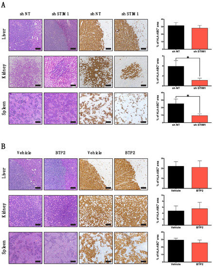 Animal experiments were performed in A2 animal facility (Bordeaux University), in accordance with national institutional guidelines and with the agreement of the local Ethic Committee on Animal Experiments CEEA50 of Bordeaux (2903-2016051011358065). To assess the cell spreading into organs, intrahepatic xenografts were performed as previously described [24]. Briefly, 5 × 105 HLY1 cells expressing shNT or shSTIM1 were intrahepatically xenografted in 8 to 15 weeks old NSG immunodeficient mice (NOD.Cg-Prkdcscid Il2rgtm1Wjl/SzJ) under 2.5% isoflurane anesthesia (Belamont, Piramal Healthcare, Northumberland, UK). For pharmacological treatments, HLY-1 parental cells were intrahepatically xenografted and mice were treated by intraperitoneal injection of vehicle or SOCE inhibitor BTP2 (12 µg/kg) three times per week [25]. A global surveillance of animal health was performed two to three times per week. Four weeks after engraftment, mice were sacrificed. Liver, spleen, and kidneys were removed and cut in half. One half was fixed in 4% formaldehyde for immunohistochemistry and the other half was kept for flow cytometry analysis. Ten mice were grafted for each cell line.