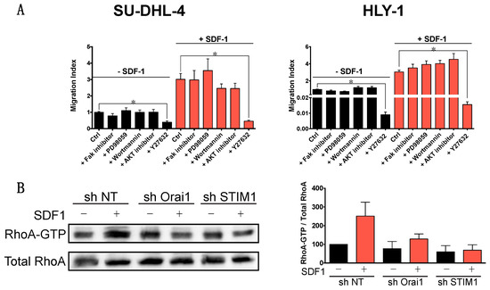 Orai1 and STIM1 control DLBCL cell migration through RhoA activation, ROCK, and MLC phosphorylation. (A) SDF-1-induced SU-DHL-4 and HLY-1 cell migration is ROCK activation dependent. Cells incubated or not with SDF-1 (100 ng/mL) were pre-treated during 20 min in the presence or not of various inhibitors (FAK inhibitor 1 µM, PD98059 a MEK inhibitor 10 µM, Wortmannin a PI3K inhibitor 10 nM, AKT inhibitor 250 nM, Y27632 a ROCK inhibitor 1 µM). Data are represented as mean ± SEM of 3 independent experiments, * p < 0.05. (B) SDF-1-induced RhoA activation is impaired by shOrai1 and shSTIM1 in SU-DHL-4 cells. Left: Cells were treated for 30 min with SDF-1 (200 ng/mL) and RhoA activation was evaluated by pull-down assay and western blot. Right: Quantification of western blot performed after pull-down assays (n = 3) (C) Orai1 and STIM1 act as regulators of the MLC phosphorylation. Immunofluorescence of SU-DHL-4 cells under-expressing, or not, Orai1 or STIM1 seeded on glass coverslips, fibronectin coated, were stimulated, or not, with SDF-1 (200 ng/mL) for 1 h. Ser19phosphoMLC2 was immunostained with mouse anti-phosphoMLC2 mAb revealed using secondary Alexa488-coupled donkey anti-mouse Ab (in green), F-actin was revealed with Phalloïdin-AlexaFluor 594 (in red) and nuclei were stained using Hoechst 33258 (in blue). Cells in square are zoomed and shown below. Images were acquired using a Zeiss LSM 510 meta confocal microscope (Zeiss, Göttingen, Germany) with an ApoPLAN 63× objective. Scale bar = 20 µm.