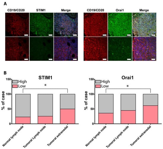 Orai1 and STIM1 expression is altered in extra-nodal DLBCL. (A) Representative immunofluorescent staining of STIM1 and Orai1 in normal lymph node and extra-nodal DLBCL under-expressing STIM1 or Orai1. Images were acquired using Leica DMI8 microscope equipped with a 40× oil immersion objective. TMA including samples from normal lymph node (n = 26), nodal (n = 43) and extra-nodal (n = 44) DLBCL was co-immunostained using Orai1 or STIM1 antibodies revealed by donkey anti-rabbit Alexa-488 (in green) and mouse anti-human CD20 and anti-human CD19 revealed by goat anti-mouse Alexa 532 (in red). Nuclei were stained with DAPI (in blue). Scale bar = 50 µm. (B) Quantification of STIM1 or Orai1 alteration in DLBCL samples. After acquisition of spot fluorescence on Icys laser scanning cytometer, a segmentation analysis base on phantoms was done to determine the percentage of CD20/CD19 positive cells expressing protein of interest for each spot. The stacked column charts illustrate the intensity grade for STIM1 or Orai1 expression in surgical specimens. * p < 0.05 by Chi-square test.
