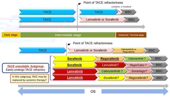 The results of the RESORCE trial also showed that sorafenib–regorafenib sequential therapy yielded good OS (26 months from starting sorafenib vs. 19.2 months for placebo) [,]. This is an extremely important finding. This long survival time of 26 months nearly rivals conventional TACE outcomes for intermediate-stage HCC [,]. The only phase III prospective trial with survival times for the TACE placebo arm presented is the BRISK TA trial, which has the largest enrollment of any such trial in the world. For the above reasons, the outcomes of the placebo arm in this trial could currently be considered the global standard for TACE outcomes with no selection bias whatsoever. The patient population for this trial was 82% early/intermediate-stage (BCLC B: 59%; BCLC A: 23%; BCLC C: 17%), with only 17% of participants in the advanced stage. In contrast, the RESORCE trial enrolled 86% BCLC C advanced-stage patients. When the two cohorts are compared directly, OS is comparable between TACE and sorafenib–regorafenib sequential therapy (26.1 months vs. 26 months). It may not be appropriate to compare individual arms of completely different randomized controlled trials (RCTs), but they are placebo arms of well-designed RCTs, and thus have no selection bias. At the very least, the fact that OS is comparable between the two is very important because sorafenib-regorafenib sequential therapy was applied to a population with much more advanced disease (i.e., advanced-stage HCC). Undoubtedly the patient population is certainly highly selected, but this means that the same effect obtained with TACE in the population for which TACE is indicated can be obtained with sorafenib-regorafenib sequential therapy in patients with advanced-stage HCC. Now that the potential of sorafenib-regorafenib sequential therapy to greatly improve prognosis is clear, it may be necessary to re-evaluate the appropriate timing for starting sorafenib. The conventional practice has been to switch from TACE to systemic therapy at the point when the patient is found to be refractory to TACE, but one could envision that it may become increasingly important to identify subgroups that tend to be refractory to TACE and start systemic therapy earlier than usual in those groups (while hepatic functional reserve is still Child-Pugh 5 before they are found to be refractory to TACE) [] (Figure 1). These patient subgroup can be categorized as “TACE unsuitable patient subpopulation”.