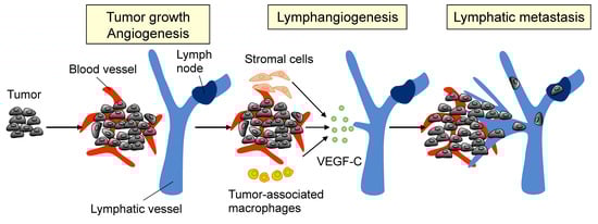 Tumor lymphangiogenesis. The primary tumor, as well as stromal cells and tumor-associated macrophages, release vascular endothelial growth factor-C (VEGF-C) to initiate tumor lymphangiogenesis. Once VEGF-C activates lymphatic endothelial cells (LECs) by binding to VEGFR-3, the cells proliferate and migrate to form new lymphatic vessels in the primary tumor.