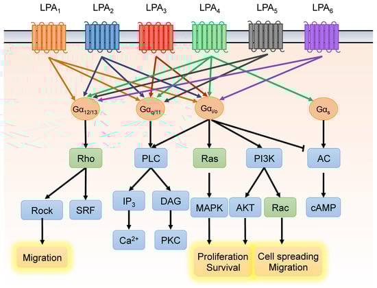 Lysophosphatidic acid (LPA) receptors and downstream signaling pathways. LPA binds LPA receptors (LPA1–6) with varying affinities, triggering various downstream signaling cascades via receptor coupling to four different heterotrimeric G proteins. Through this signaling mechanism, LPA mediates cellular events such as cell proliferation, apoptosis, migration, and differentiation.