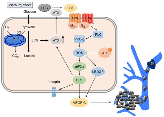 LPA–VEGF-C signaling in prostate cancer (PCa). Advanced PCa tumor cells utilize aerobic glycolysis (called the Warburg effect) to produce LPA via the promotion of autotaxin (ATX) expression. The activation of LPA signaling via LPA receptors (LPA1 and LPA3) stimulates downstream reactive oxygen species (ROS) and the ER regulators, eukaryotic initiation factor α (eIF2α) and calreticulin (CRT). Phospholipase C (PLC) and protein kinase C-ζ (PKC-ζ) are also involved in ROS production, whereas activation of the androgen receptor (AR) suppresses LPA-mediated ROS. ROS production initiates VEGF-C production and release, stimulating tumor lymphangiogenesis and lymphatic metastasis. Additionally, CRT affects the amount of membrane integrin to control cell migration. LPA promotes CRT expression, which triggers feedback regulation of ATX expression. LPC, lysophosphatidic choline. LEDGF, lens epithelium-derived growth factor.