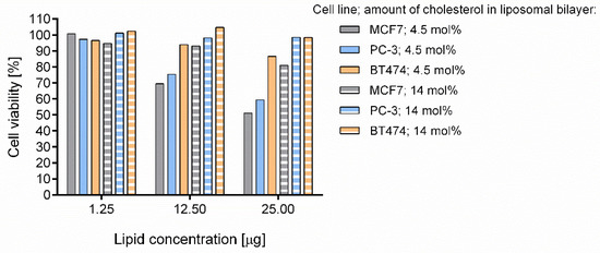 One of the following steps aiming to determine the optimal lipid composition of the designed liposomes was to check the viability of selected breast cancer cells after treatment with the empty liposomal envelope. The compositions of tested empty liposomes were almost identical to the composition of the drug-carrier preparation, with the difference that in one case 9.5 mol % of simvastatin was replaced with HSPC, and in the second with cholesterol (see Table 2).