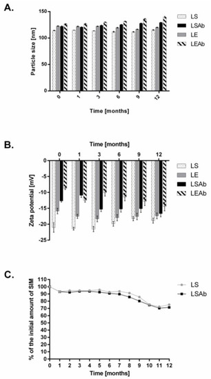 Stability of targeted and non-targeted liposomes during 12 months of storage as a suspension. Both liposomal and immunoliposomal formulations of simvastatin were stored at 4 °C. After every month, changes in liposome diameter (A), zeta potential (B) and simvastatin content (C) were measured. LS—non-targeted liposomes with simvastatin, LSAb—immunoliposomes with simvastatin, LE—non-targeted empty liposomes, LEAb—empty immunoliposomes.